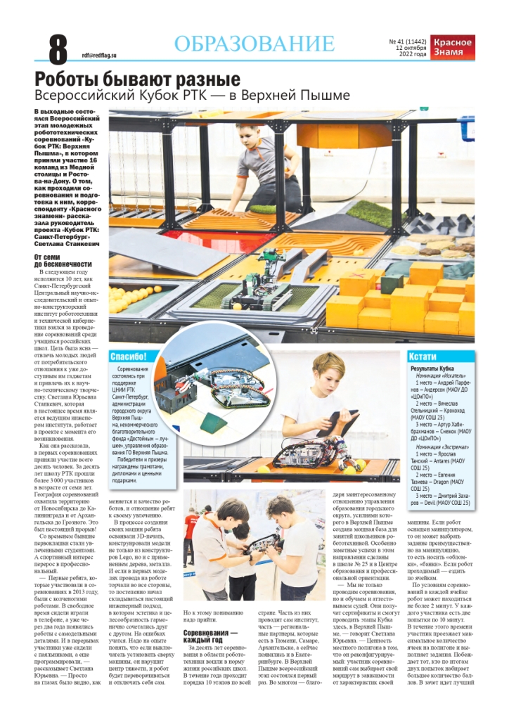 Корреспондент «Красного знамени» Марина Осенкова посетила соревнования юных робототехников и побеседовала как с участниками, так и руководителем проекта «Кубок РТК» Светланой Станкевич. Статья «Роботы бывают разные» опубликована в номере газеты от 12 октября (№41)