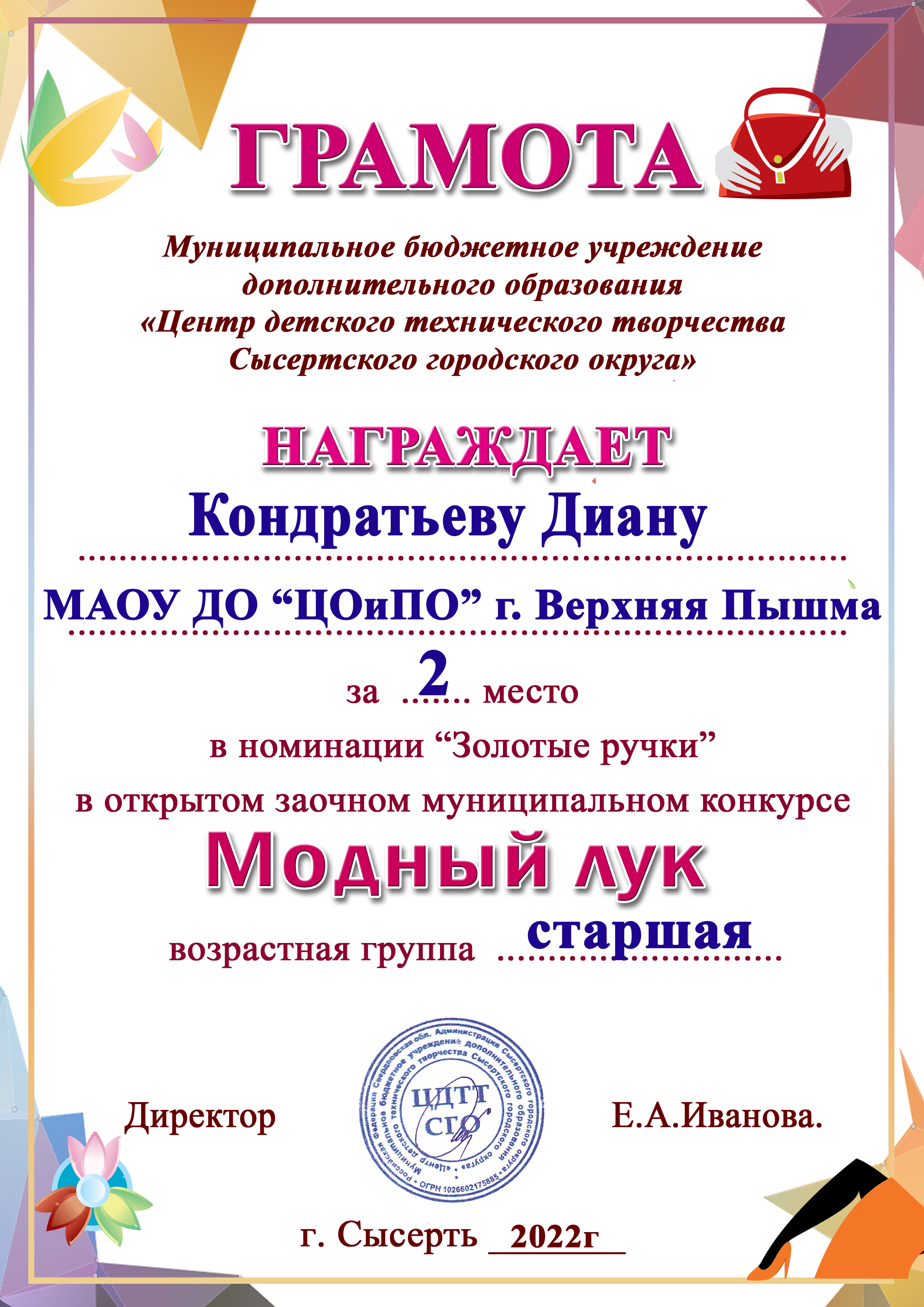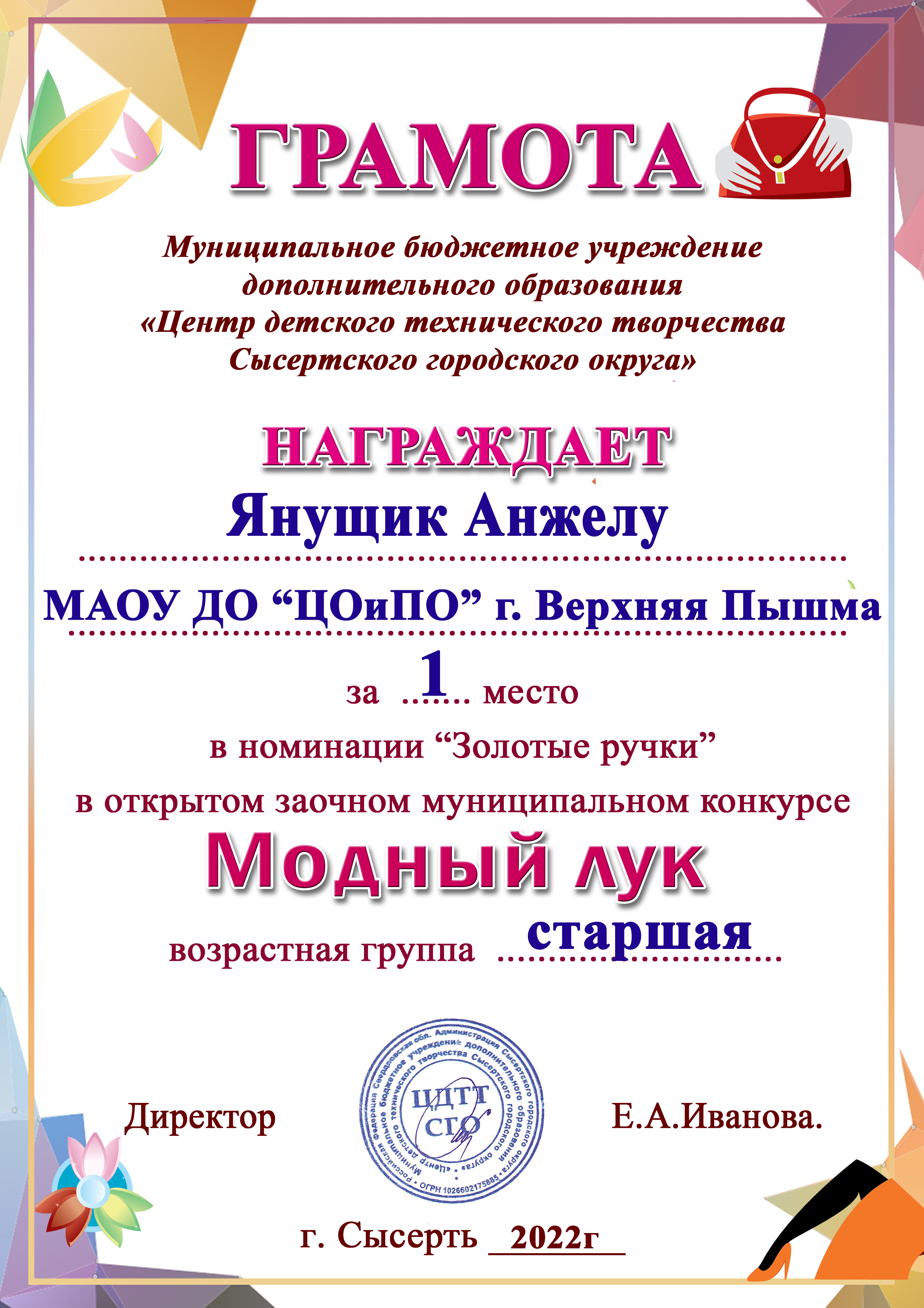 В младшей возрастной категории были отмечены дипломами за участие Куликова Варвара и Рудницкая София. В старшей возрастной категории взяты призовые места: в номинации «Золотые ручки» 2-ое место присуждено Кондратьевой Диане и 1-ое место у Янущик Анжелы.