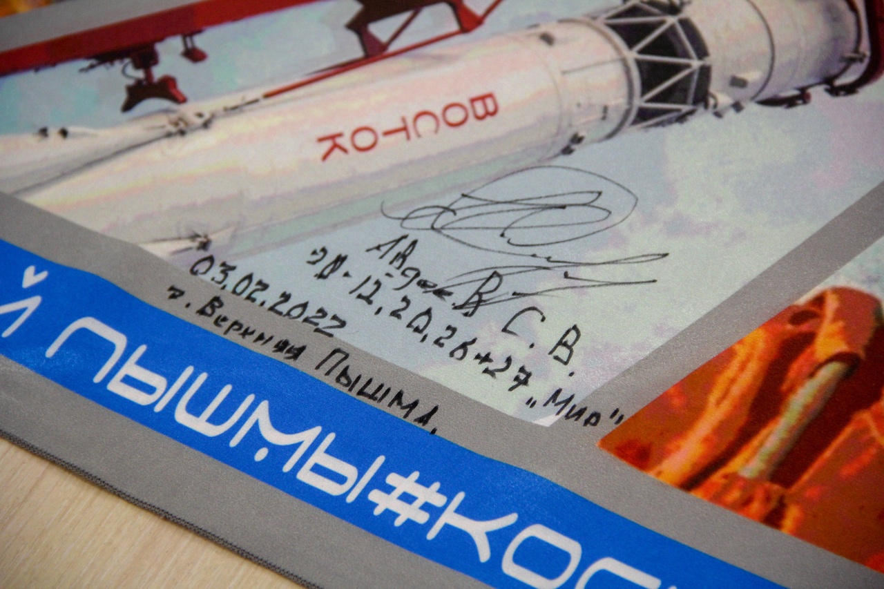 Платок уникален тем, что имеет автографы Героев России, космонавтов С.В. Авдеева и О.Г. Артемьева.
