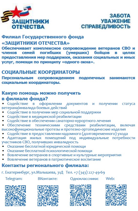 В соответствии с Указом Президента Российской Федерации от 03.04.2023 № 232 «О создании Государственного фонда поддержки участников специальной военной операции «Защитники Отечества» с 01.06.2023 осуществляет свою деятельность филиал Государственного фонда поддержки участников специальной военной операции «Защитники Отечества» по Свердловской области (далее – Фонд).