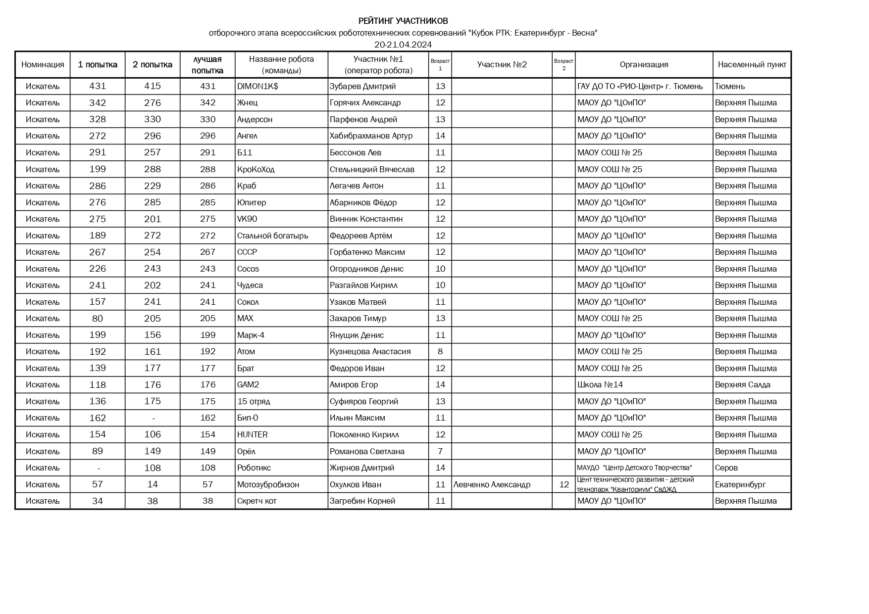 - • Информация для участников соревнований "Кубок РТК: Верхняя Пышма - весна"