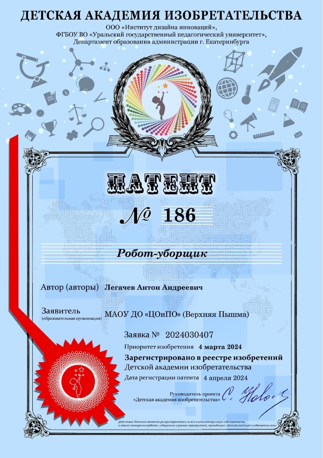 Авторам изобретений, обладающих признаками объективной новизны, выдаётся патент Детской академии изобретательства. Обладателем патента стал наш учащийся Легачев Антон с проектом "Робот-уборщик"!