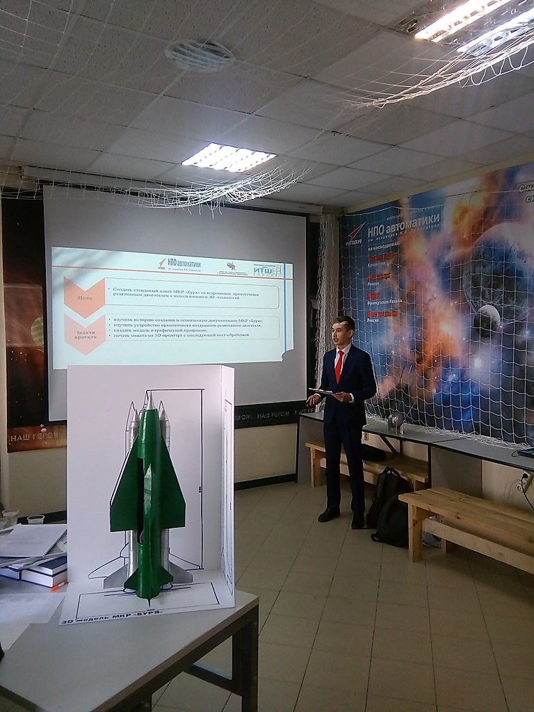 В рамках секции «Гуманитарные науки: история науки и техники, история ракетостроения, космодромы, жизнь и деятельность академика Н.А. Семихатова, космос как культура, футурология и проекты о будущем» Гусев Захар рассказал о первом ракетном истребителе БИ-1. А Колчин Дмитрий и Казанцев Никита о межконтинентальной крылатой ракете «Буря», истории ее создания и проектировании модели МКР в 3D технологиях.