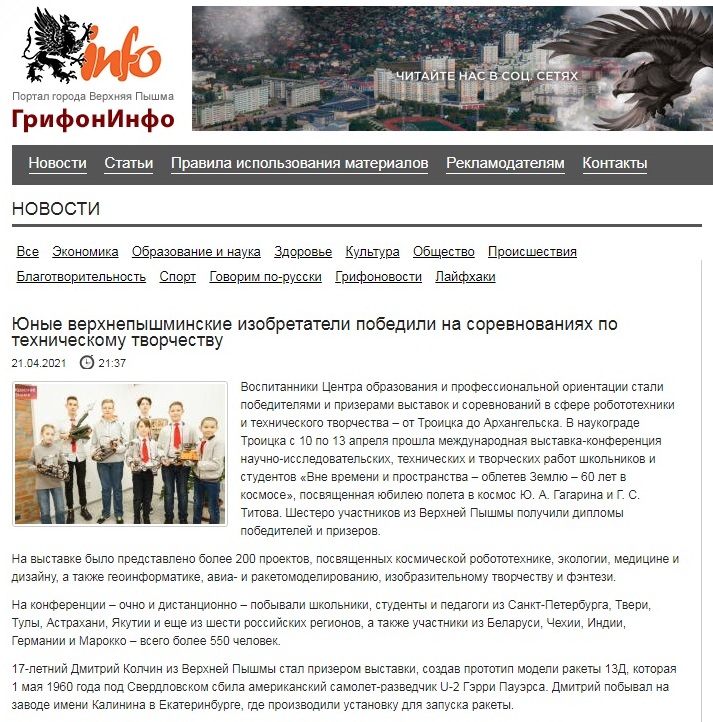 На Портале города Верхняя Пышма grifoninfo.ru опубликована статья об успешном выступлении обучающихся Центра образования на соревнованиях "Кубок РТК: Арктика" и Международной выставке научно-технических, исследовательских и творческих проектов "Вне времени и пространства - облетев Землю - 60 лет в космосе"